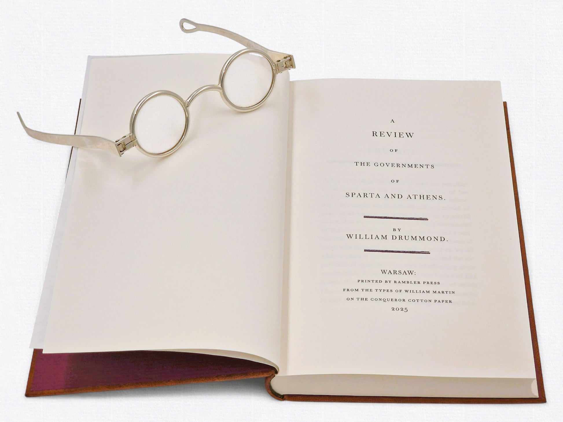 This 2025 fine press edition of Sir William Drummond’s A Review of the Governments of Sparta and Athens restores the grace and gravity of an Enlightenment text through the art of contemporary bookmaking.