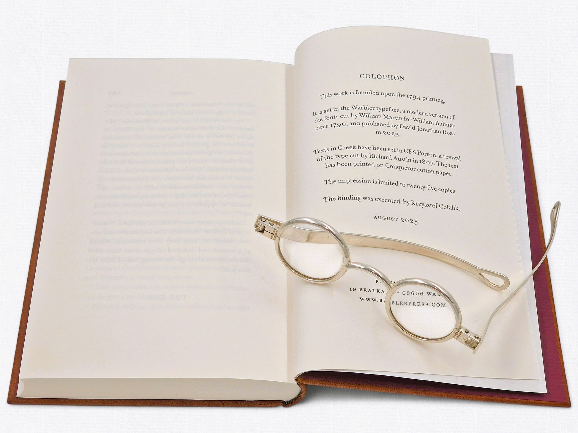 This 2025 fine press edition, limited to just twenty-five hand-numbered copies, restores the dignity of Bulmer’s original printing through contemporary craftsmanship. Each copy is hand-bound by Krzysztof Cofalik, printed on Conqueror pure cotton paper, and typeset in Warbler, a revival of William Martin’s letterforms originally cut for Bulmer’s Shakespeare Press. Greek quotations appear in GFS Porson, preserving scholarly clarity and historical accuracy.